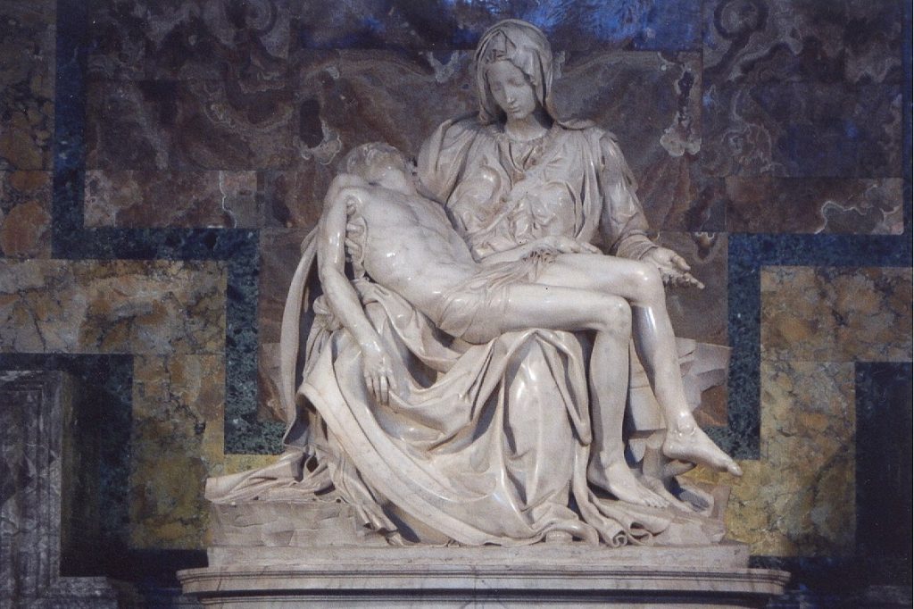 Wie anders hat Michelangelo Buonarotti mit seiner 1498 bis 1499 in einen Block aus Carrara-Marmor gehauenenen Skulptur „Pietà“ die Schmerzensmutter dargestellt.